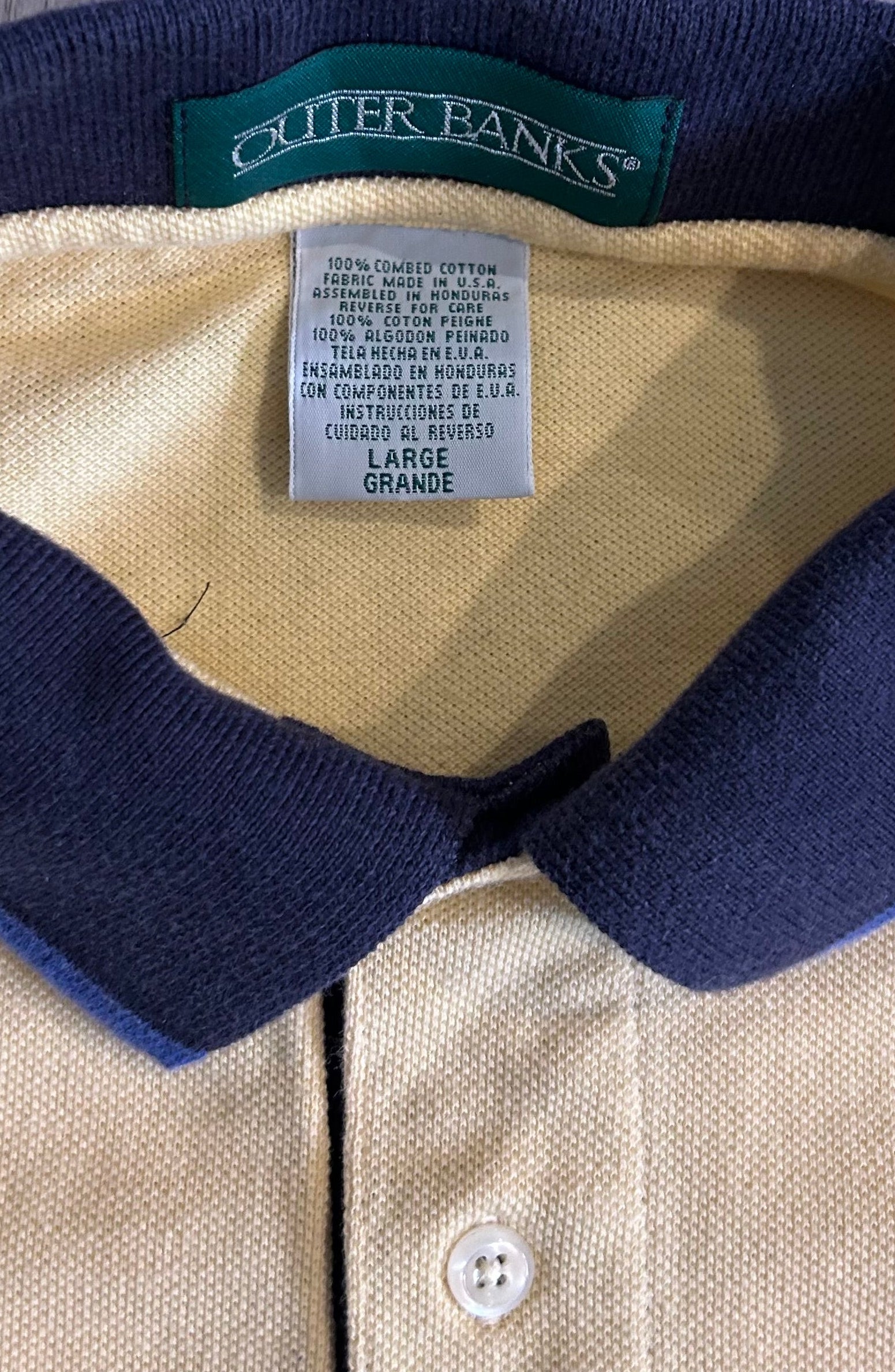 • Color: Pale yellow body w/ navy collar + sleeve trim